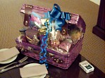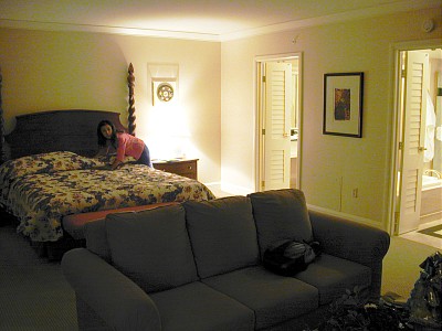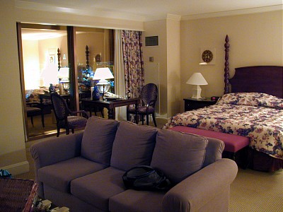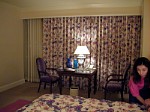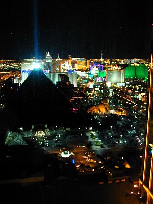 18日の夜、オフ会前になおさんご夫妻にお食事(Red square)にご招待いただ いた後、お部屋を拝見しました。スイートばかりのフロアへの専用エレベーターで上へ(何階でしたっけ…汗)。まっすぐに伸びる廊下の先にお部屋がありました。途中、画像にもあるハイローラー用のスイートのエントランスを覗くことができました。そのエントランス、NYNYの部屋の大きさくらいありしまた…すげぇ! 部屋自体はそんなに広くはありませんでしたが、ミニ・キッチンに冷蔵庫、当然お飲み物付き。応接セットにはウエルカムギフト…中には何が入っていたんでしょうか?さきイカ等のおつまみかな?(笑) そして、何よりも窓から見えるストリップの夜景。素晴らしかったです。電灯を全て消して、二人で寄り添って窓から夜景を見る…あぁ、なんてロマンチック。 窓からマンハッタンエクスプレスの絶叫と騒音とはやっぱり違いました…汗 |