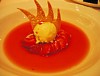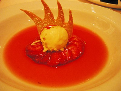 を注文しました。イチゴのソース(甘くはない)にイチゴのスライスが並び、その上にバニラアイスクリームが乗っかっています。嫁さんは、「すっぱい!」と一口食べてやめてしまいましたが、チョコレートの甘さに舌が慣らされていたためでしょう。私は、イチゴの酸味とアイスクリームの甘さがうまく調和して、美味しいと思いました。