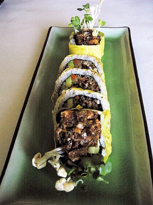 ノリ抜きの鉄火まきにマンゴーが入っていると言えばよいのでしょうか?ゲッ!マンゴーとマグロ?と拒否反応を示されている読者の顔が目に浮かびます(笑)しかしながら、意外や意外!これがうまくマッチしているんです。こんな取り合わせがあるのかと、私は感激してしまいました。が…これも、Spicyと書いてあるように、口の中はピリピリです(汗)