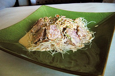 胡椒味まぐろのたたき(外側を軽くあぶったもの)と千切り野菜にとびっ子(キャビアには見えないですよね。どうみても飛び魚の子ですよね)サラダ。自信はないのですが、8割がたこの料理だと思います(汗)